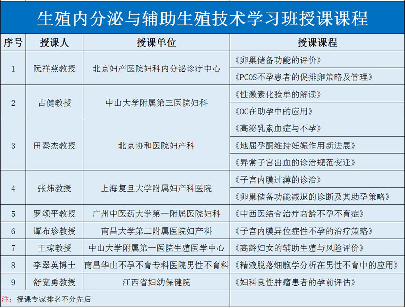 北京协和医院、北京大学第三医院、首都医学大学附属北京妇产医院、中山大学第一附属医院、广州中医药大学第一附属医院、中山大学第三附属医院、南昌大学附属第二医院、江西省妇幼保健院、南昌华山生殖医院等全国九大大国内权威医院对于4月23—24日在江西南昌对国内以及江西省内各级医院妇产科、生殖医学中心、不孕不育科等相关科室医生开展临床技术培训学习班,针对疑难不孕不育症治疗进行探讨。
